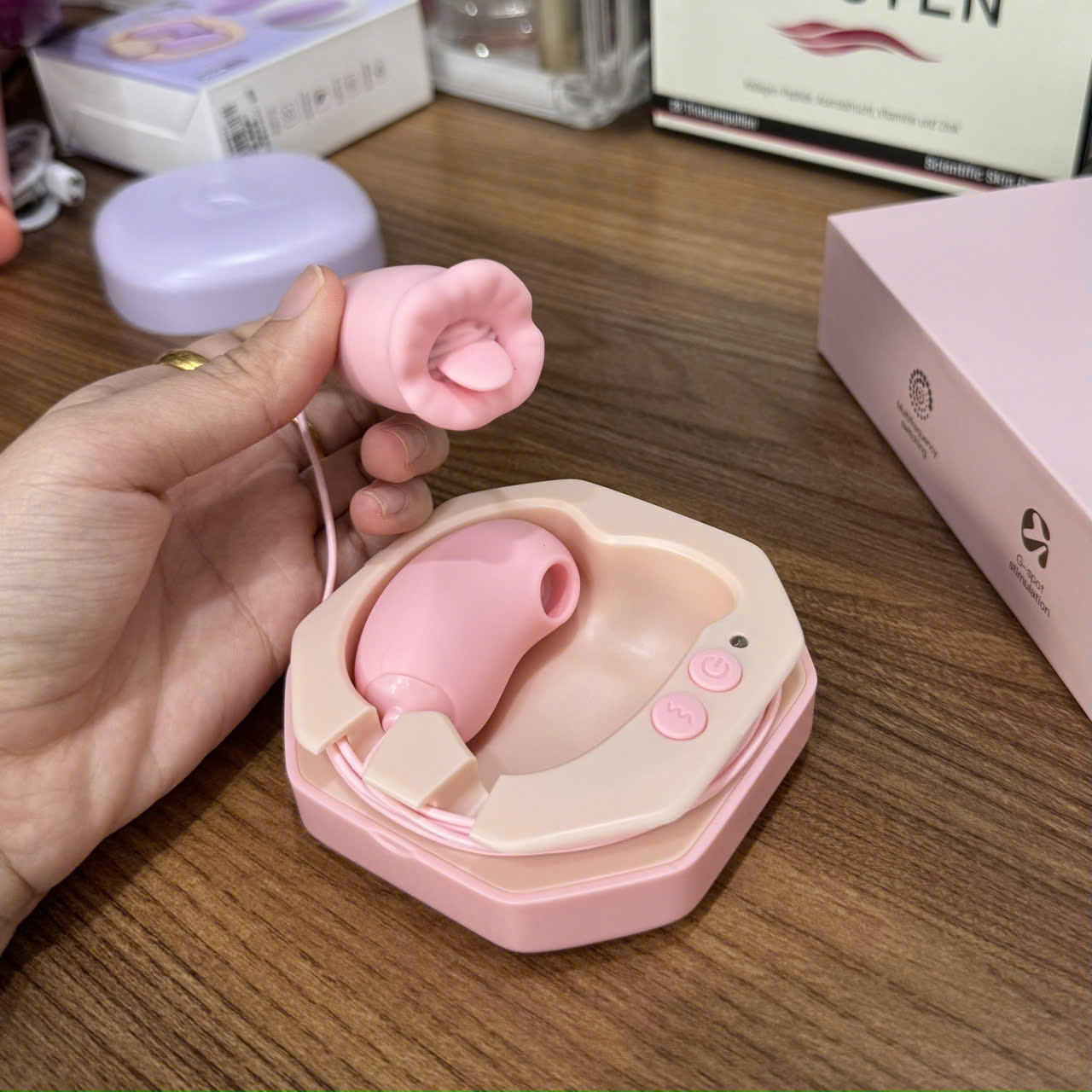 Trứng rung nguỵ trang đựng hộp xinh xắn. Kết hợp lưỡi liếm và bú mút cho ce. Chạy sạc